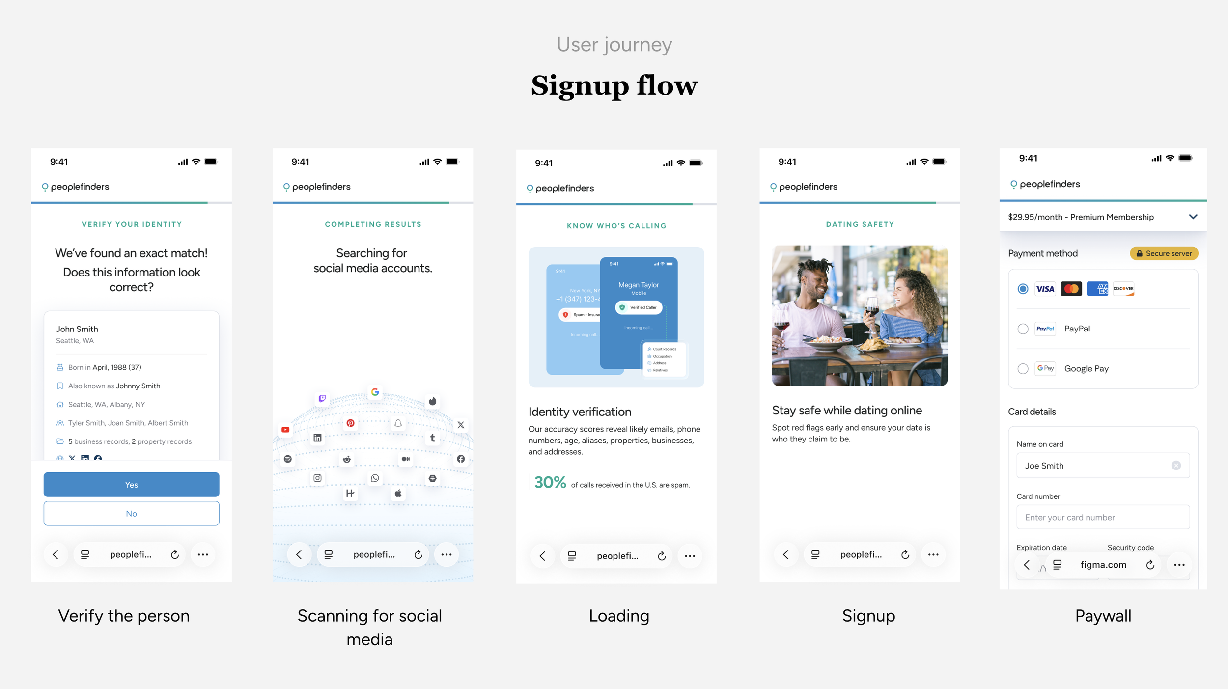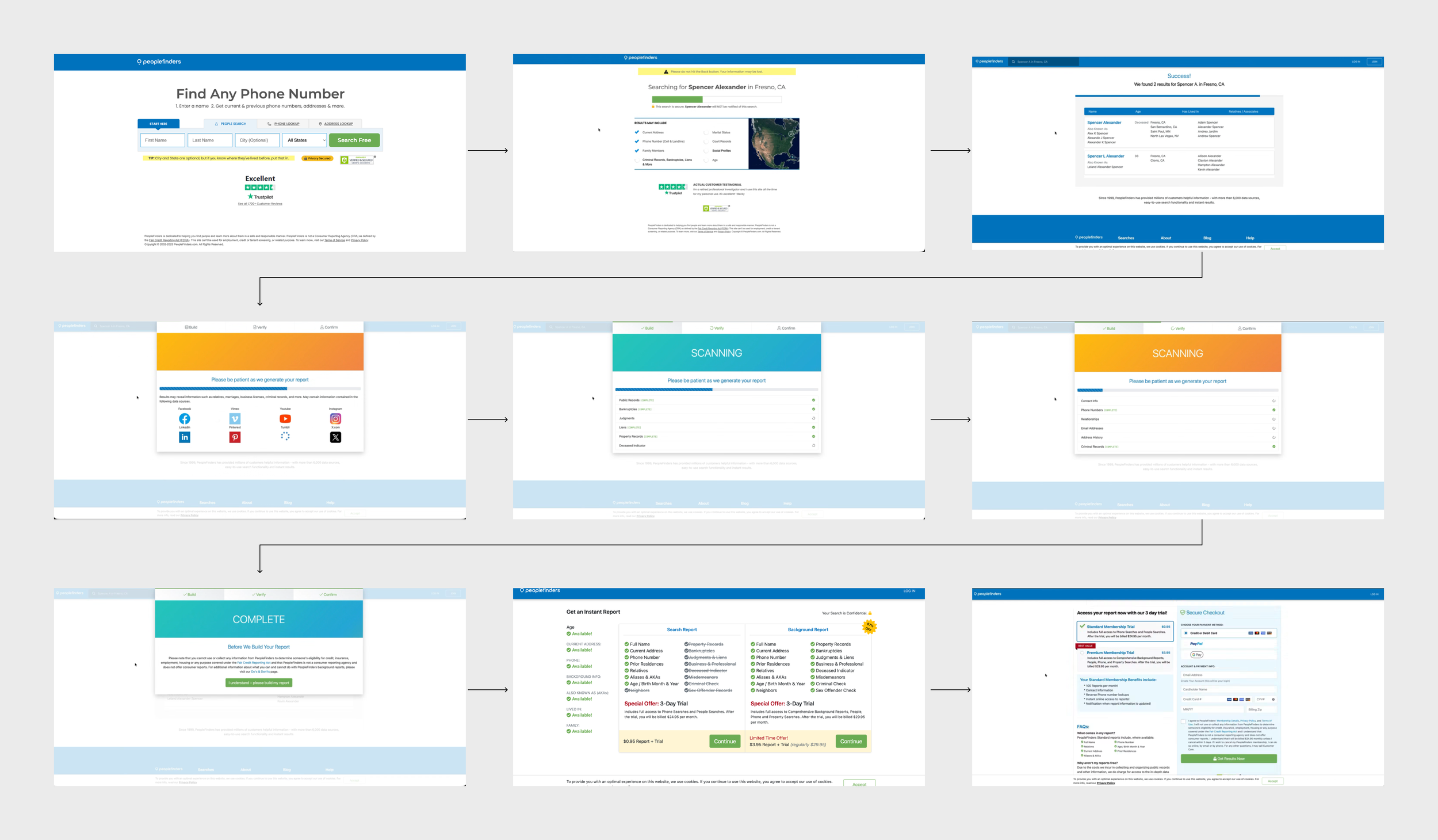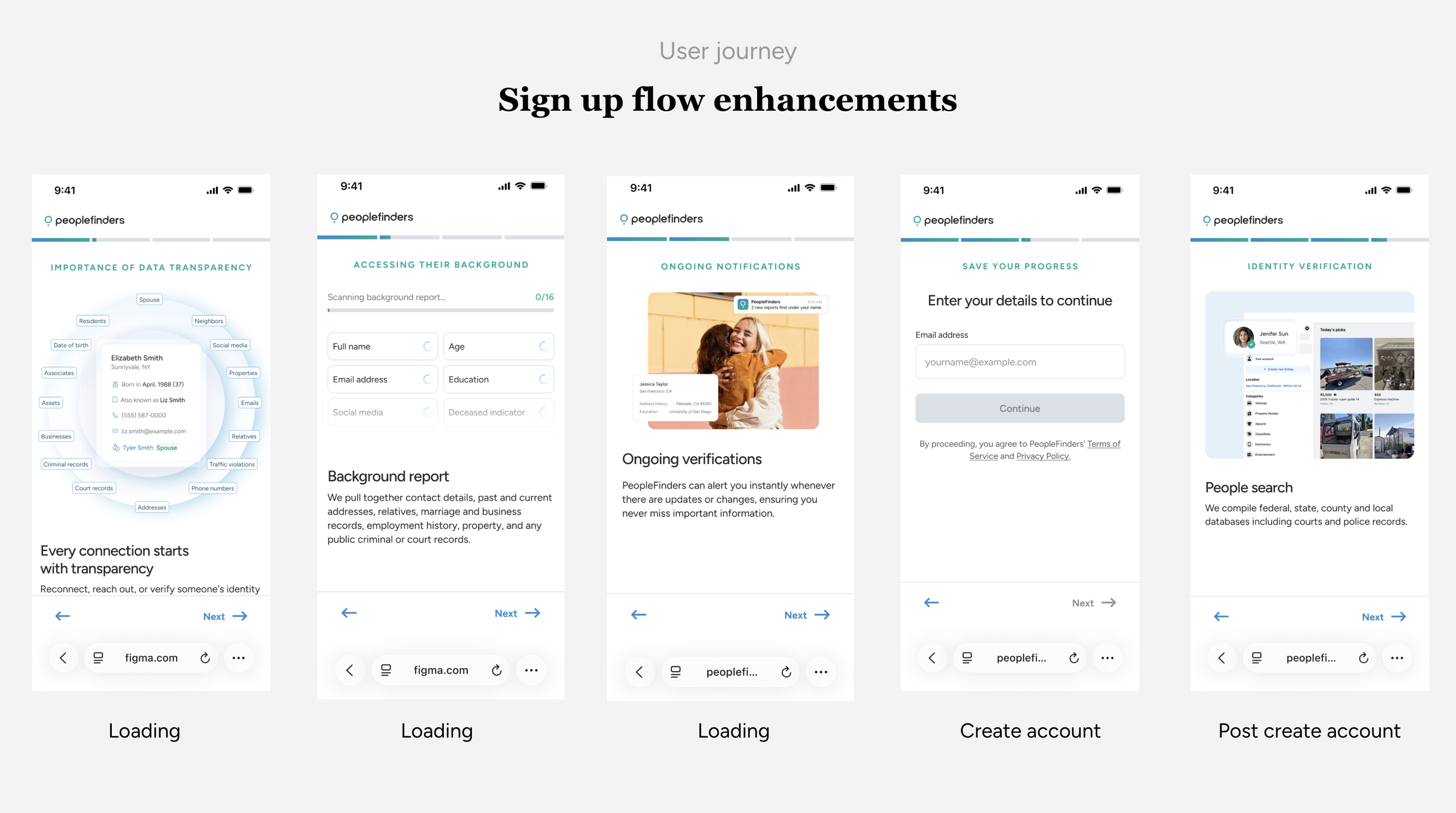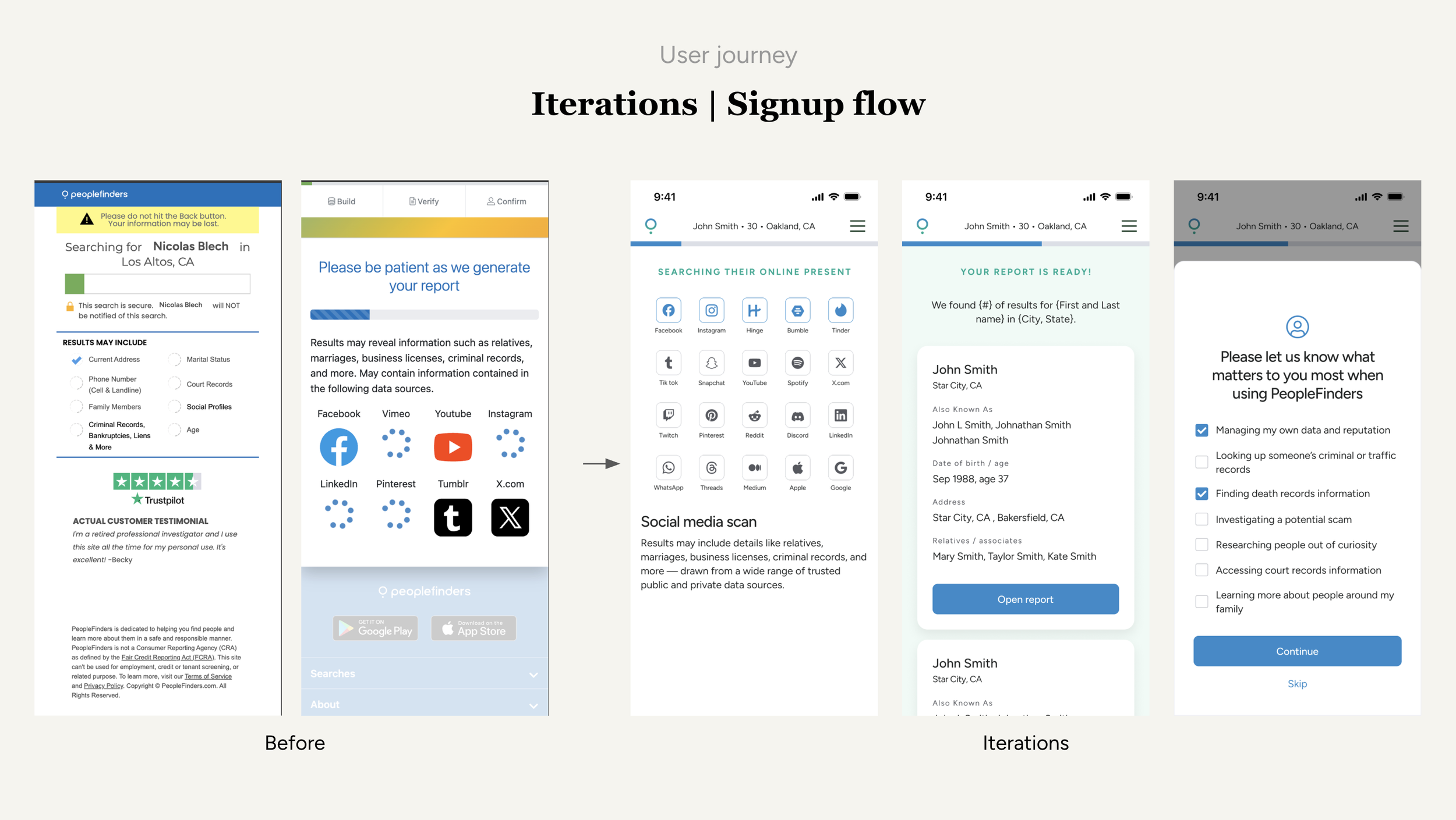 PeopleFinders’ legacy signup funnel was underperforming due to increased competition, outdated design, and slow load times. Users experienced friction and unclear value, which led to declining signups and eroding trust. Lastly, it was not mobile friendly.